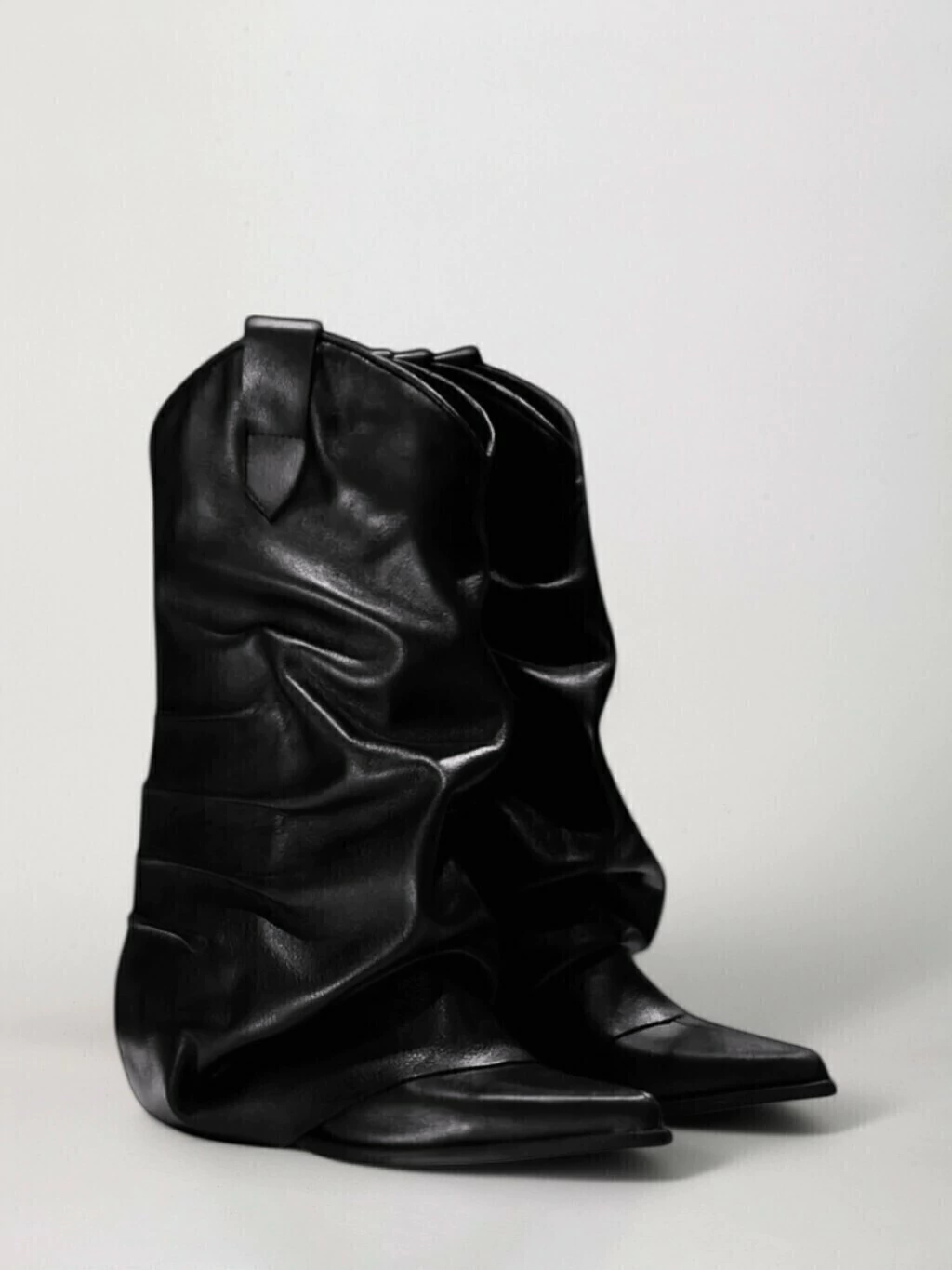 Diseño Contemporáneo: Su caña volcada y arrugada aporta un toque distintivo, elevando cualquier outfit con su estética única.